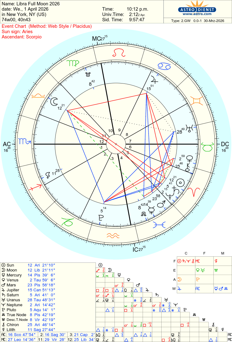 Welcome to the Libra Full Moon, the time in the lunar calendar when the spotlight is on relationship and connection, fairness and equity. Ruled by Venus, Libra reminds us of the power of compromise, that cooperation is integral to the success of life. The full moon will be exact on April 1, 2026 at 10:12 pm ET, 12 degrees Libra-Aries. That’s 7:12 pm Los Angeles, 3:12 am London on April 2, 4:12 am Johannesburg, 7:42 am New Delhi, 1:12 pm Sydney, 3:12 pm Auckland.
